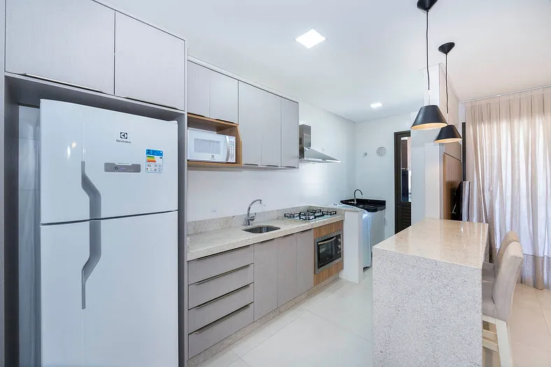 – Cocina completa con refrigerador, cocina, microondas y otros utensilios