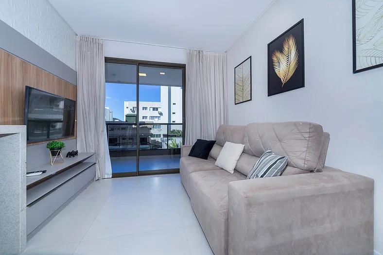 – Sala de estar con sofás, TV y aire acondicionado