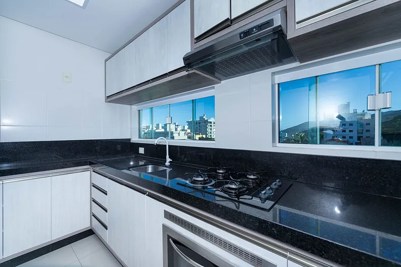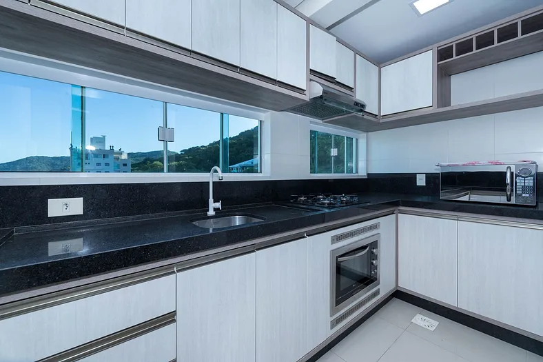 – Cocina completa con refrigerador, cocina, microondas y otros utensilios