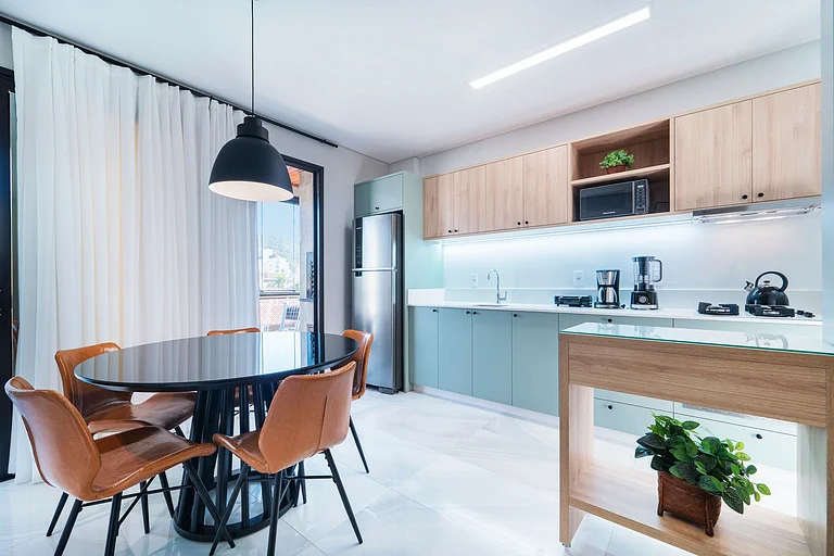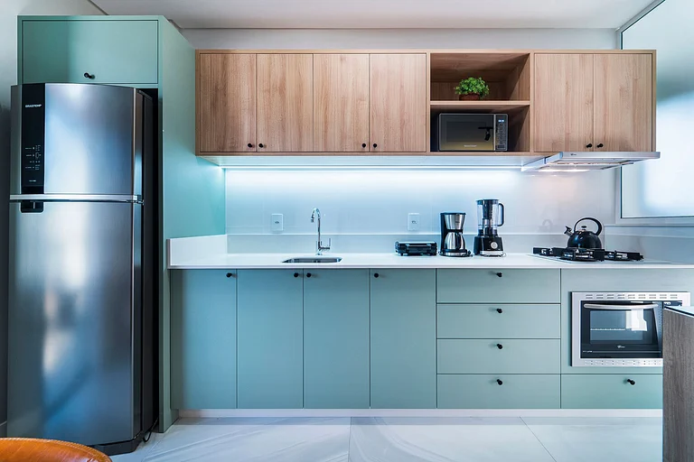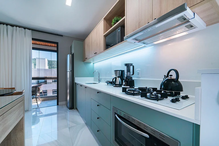 – Cocina completa con refrigerador, cocina, microondas y otros utensilios