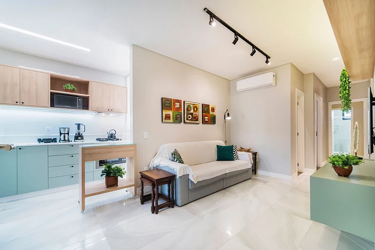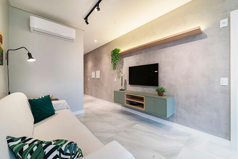– Sala de estar con sofás, TV y aire acondicionado