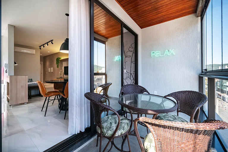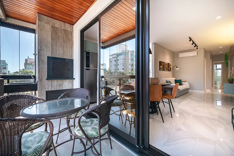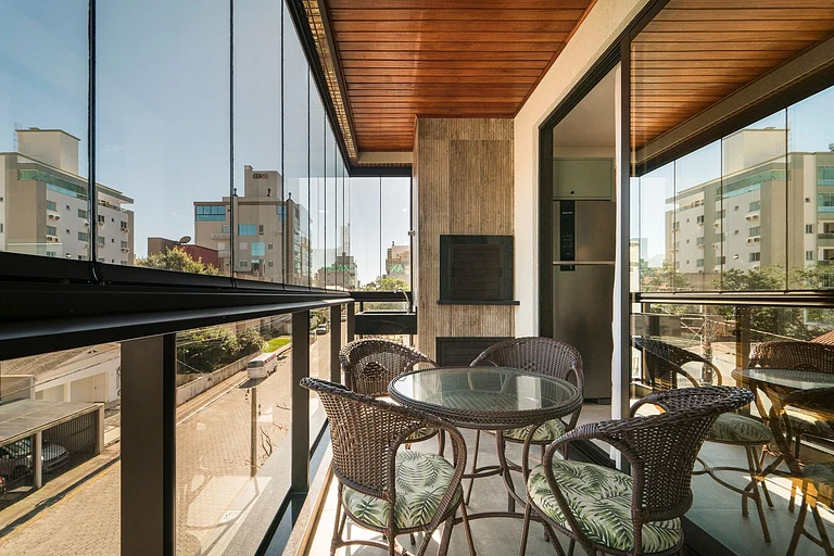 – Balcón con asador, mesa, sillas y cerramiento de vidrio