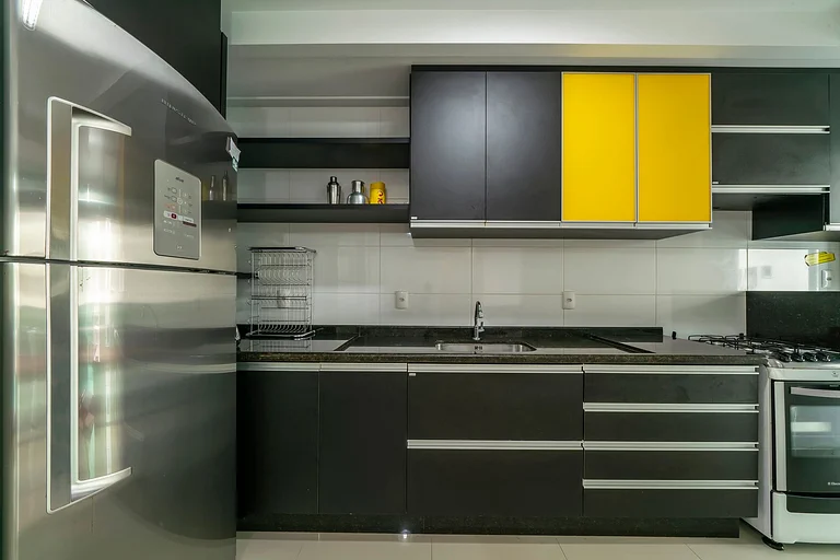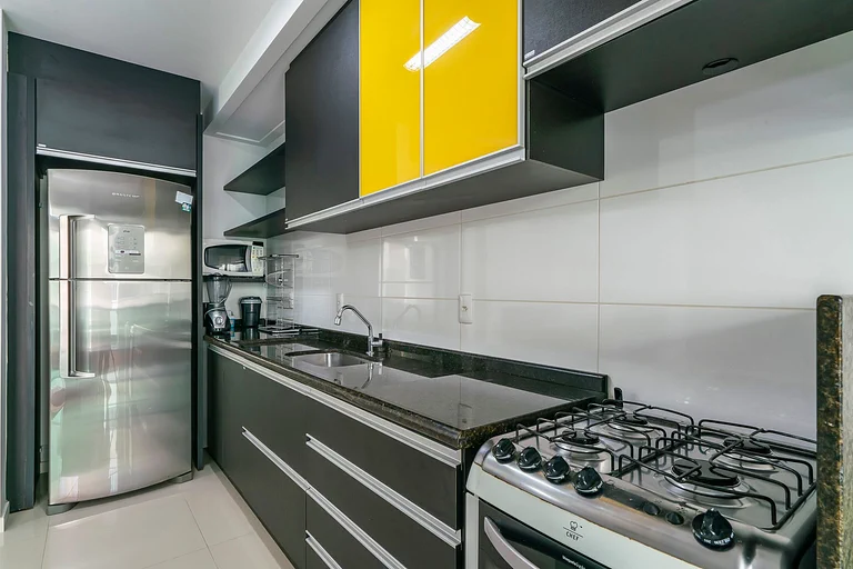 – Cocina completa con refrigerador, cocina, microondas y otros utensilios