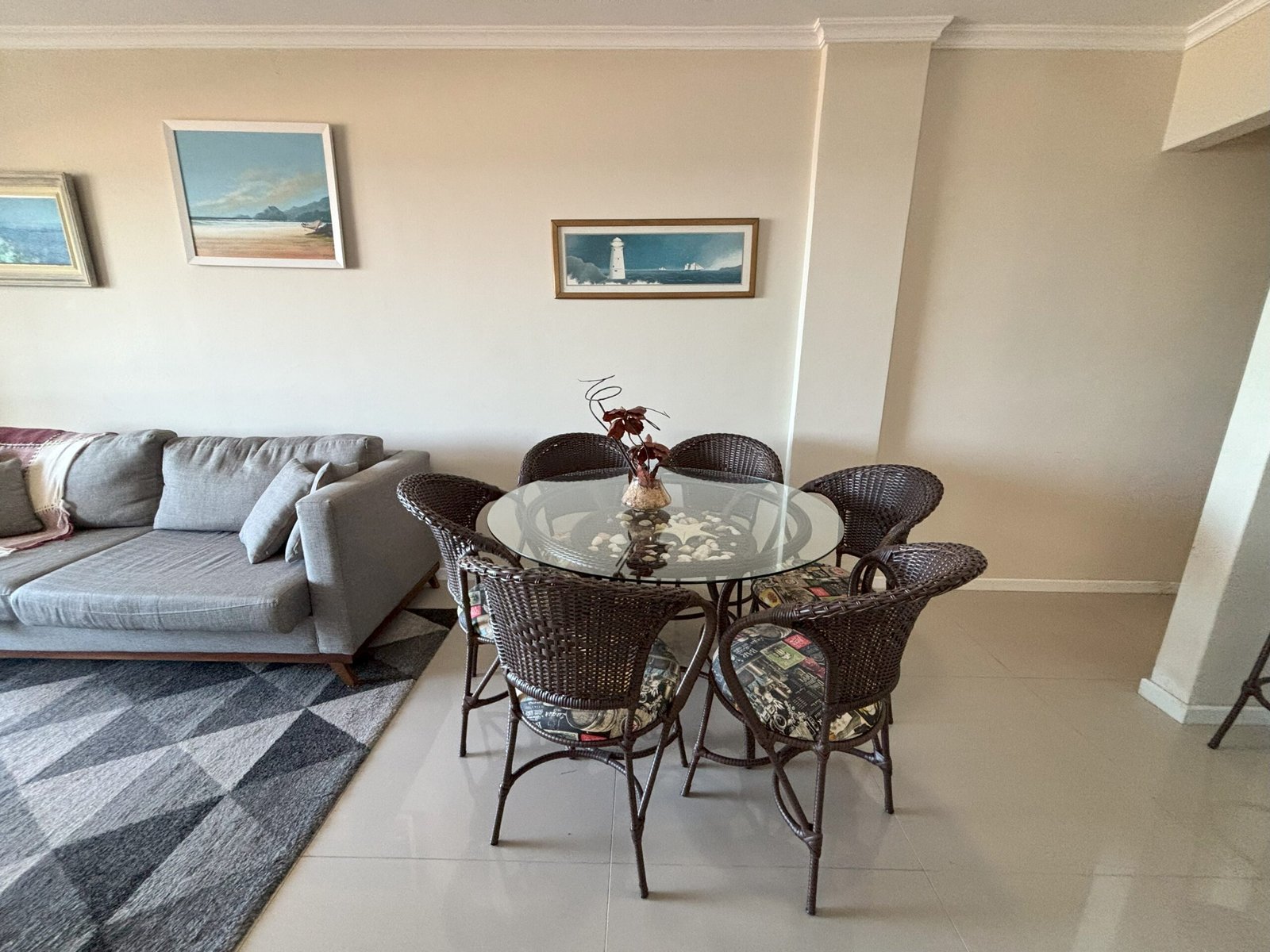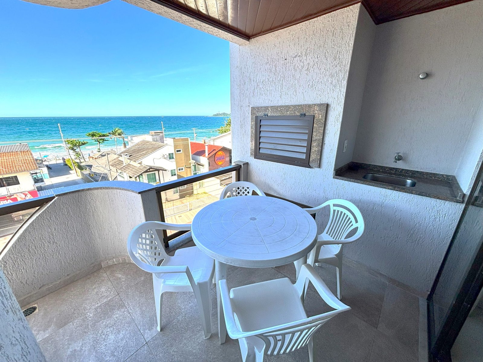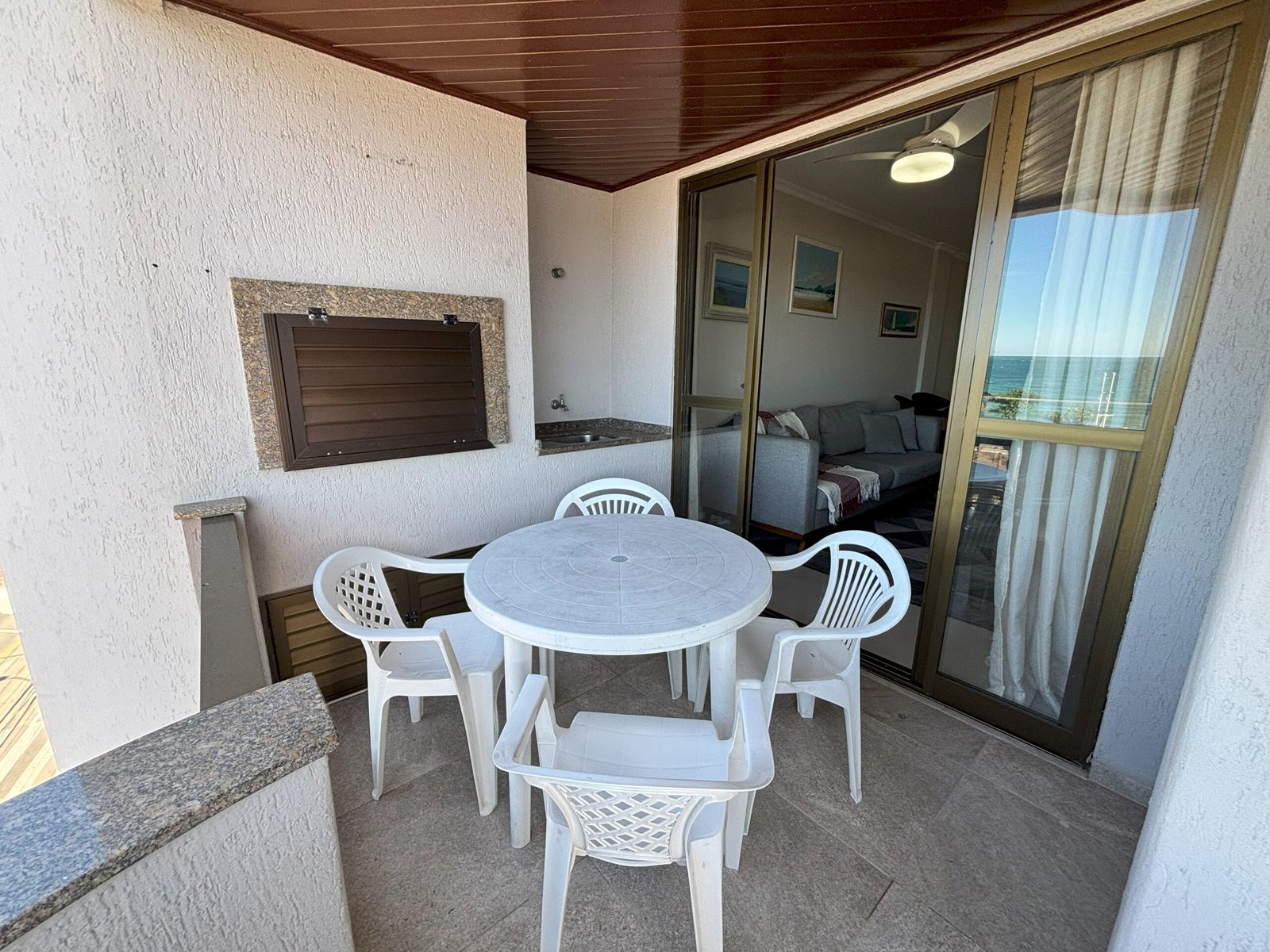 balcón con asador, mesa y sillas plásticas