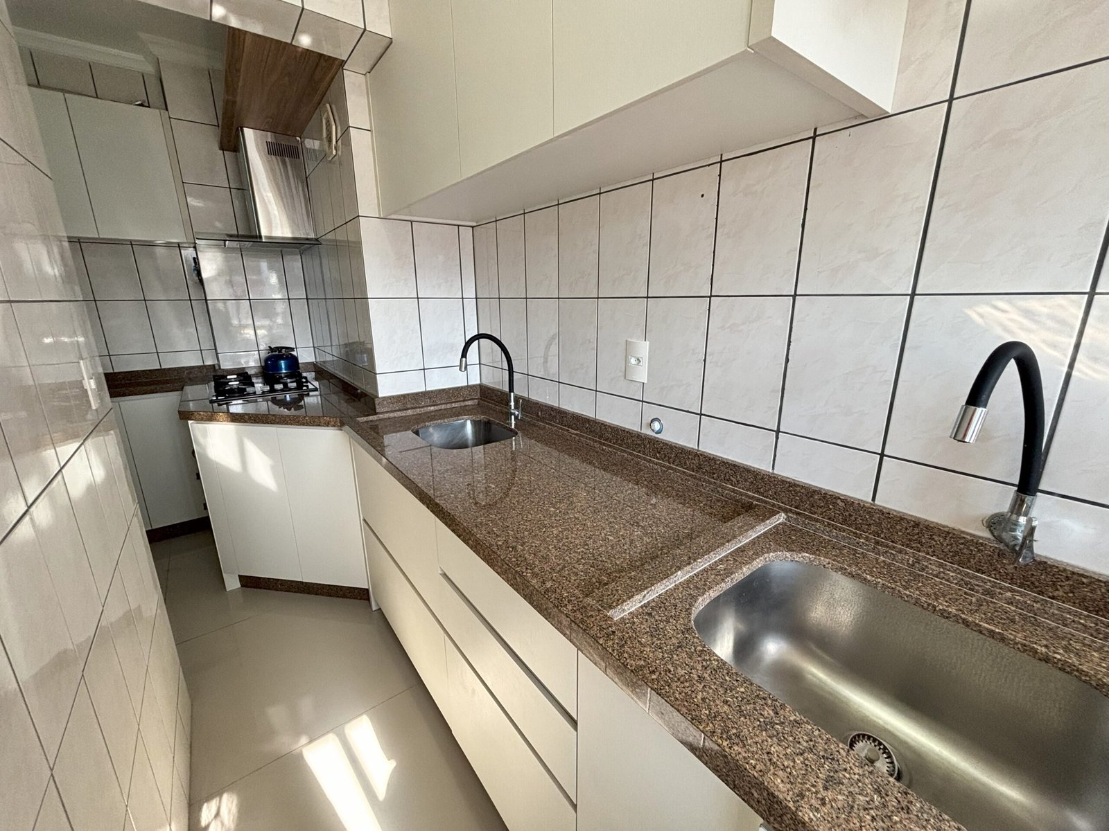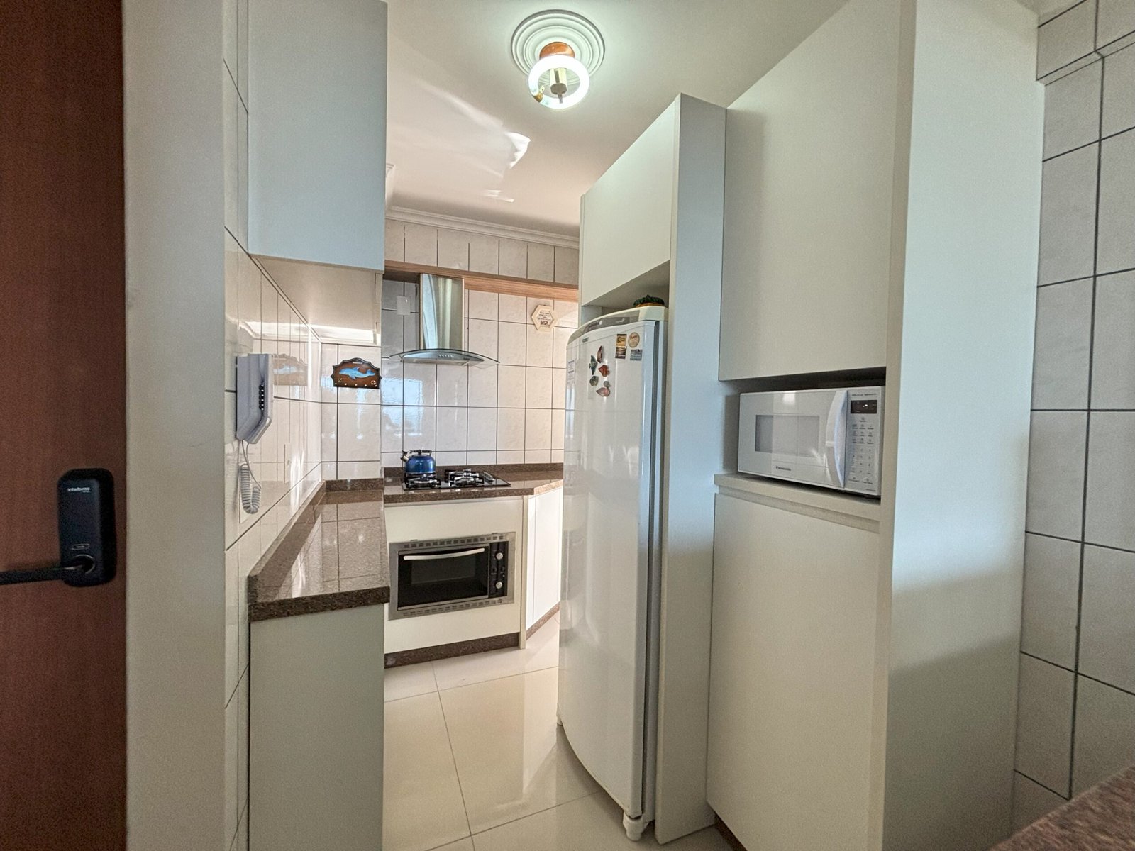 Cocina con refrigerador, estufa y otros utensilios básicos