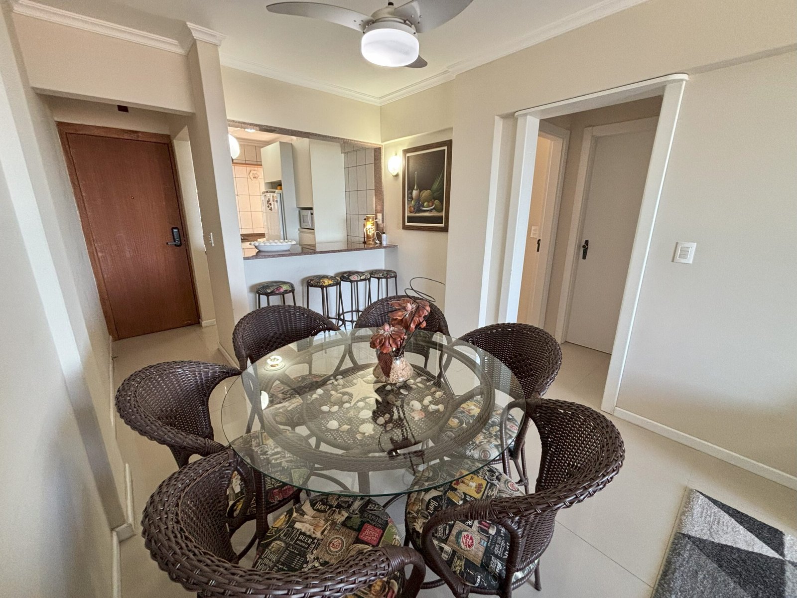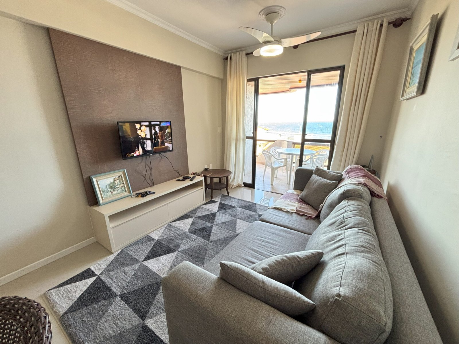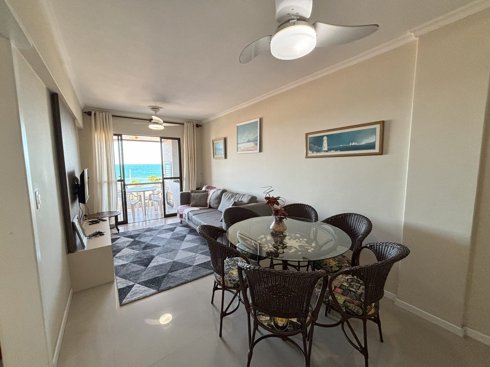Comedor y sala de estar con TV y ventilador de techo