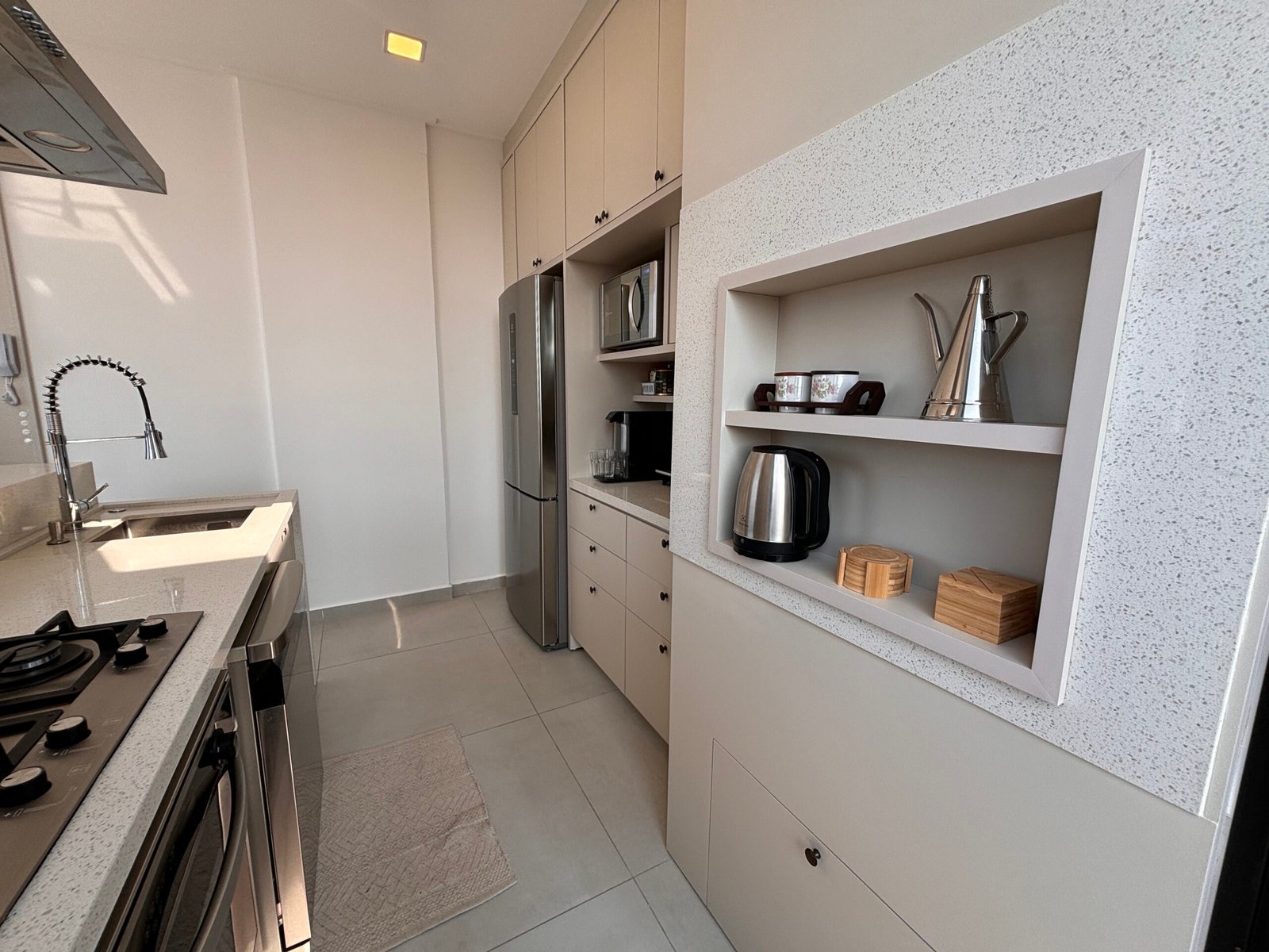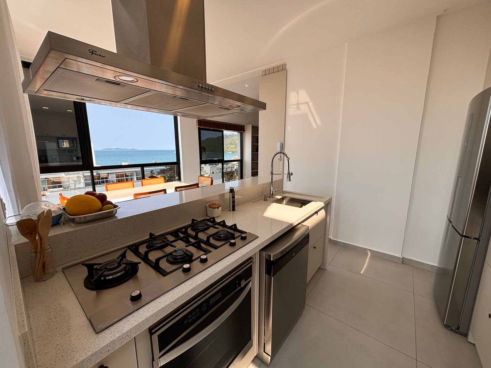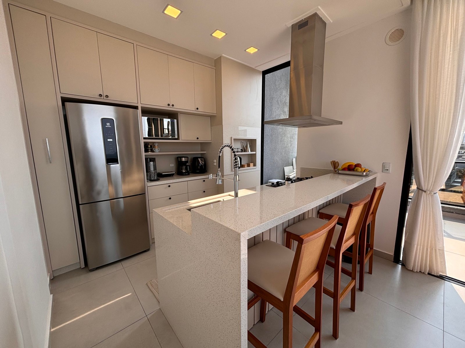 – Cocina completa con desayunador refrigerador, cocina, microondas y otros utensilios