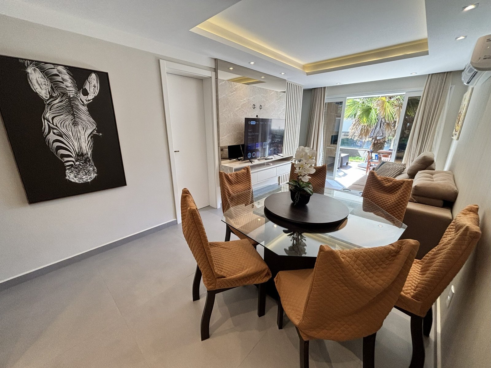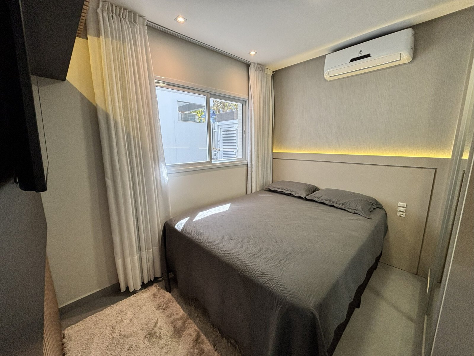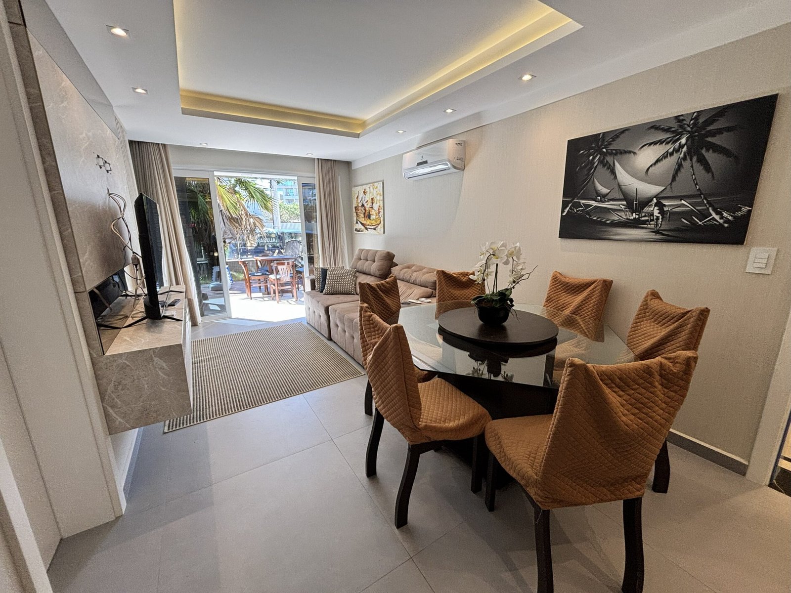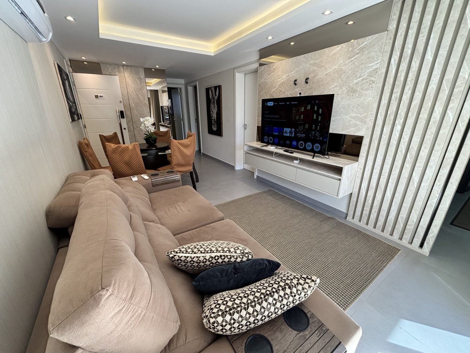 – Sala de estar con sofá, TV y aire acondicionado