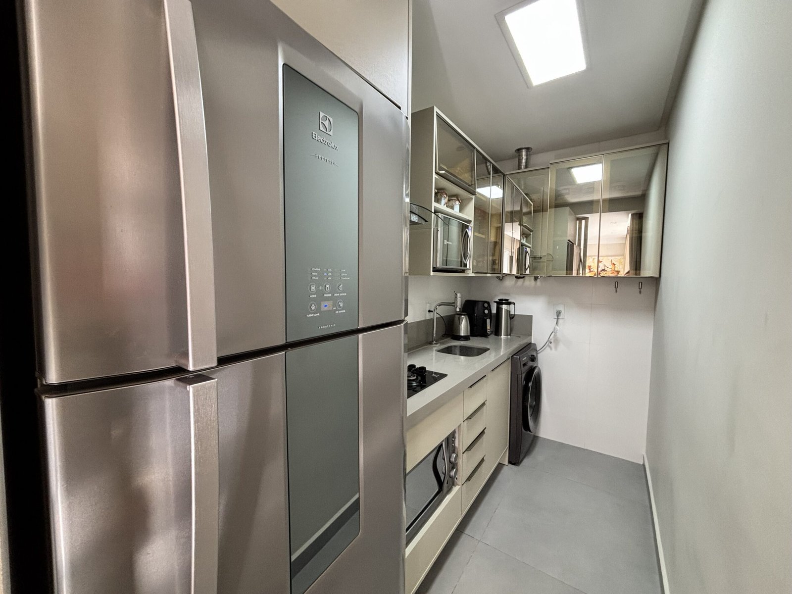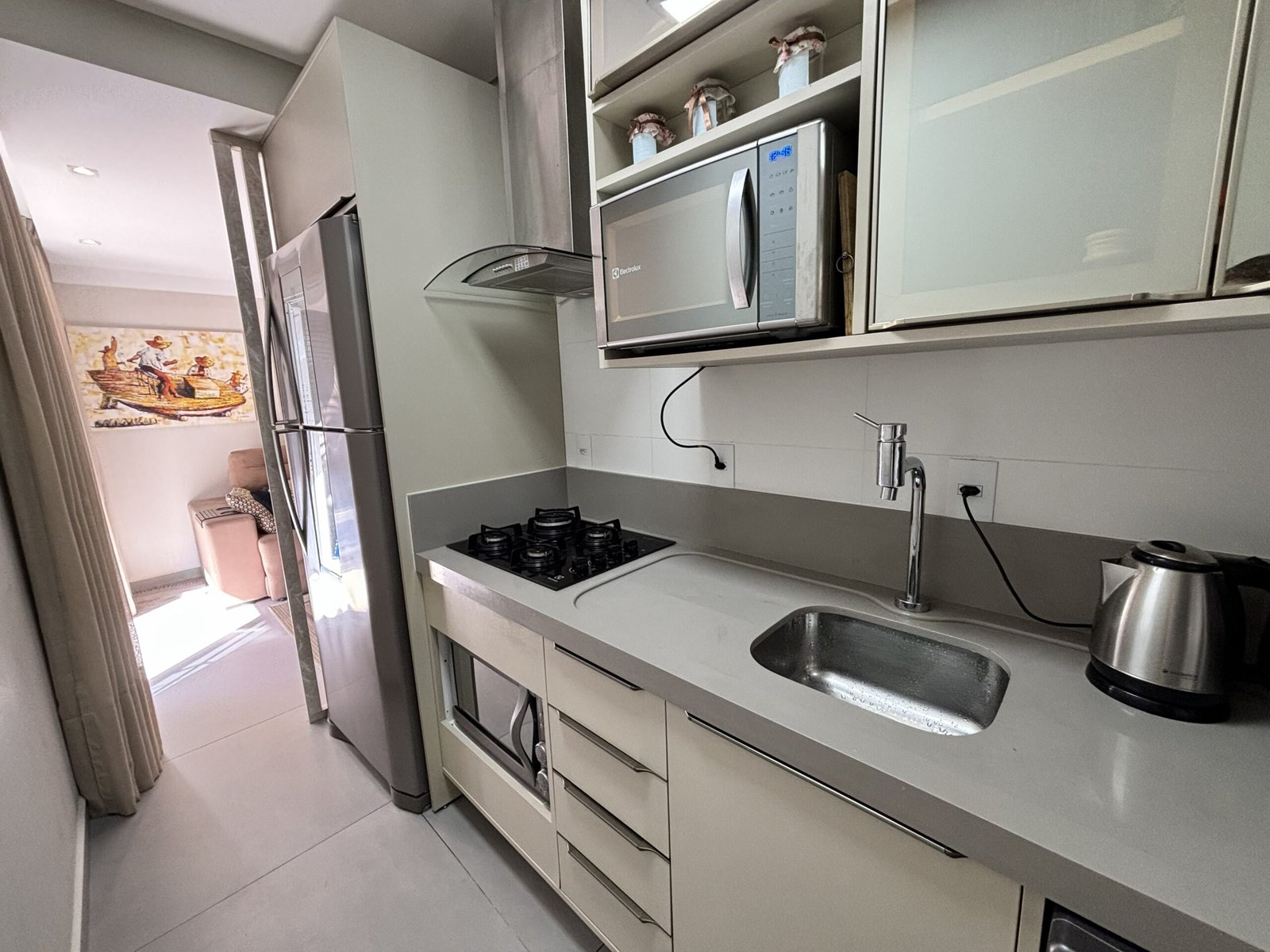 – Cocina completa con refrigerador, cocina, microondas y otros utensilios