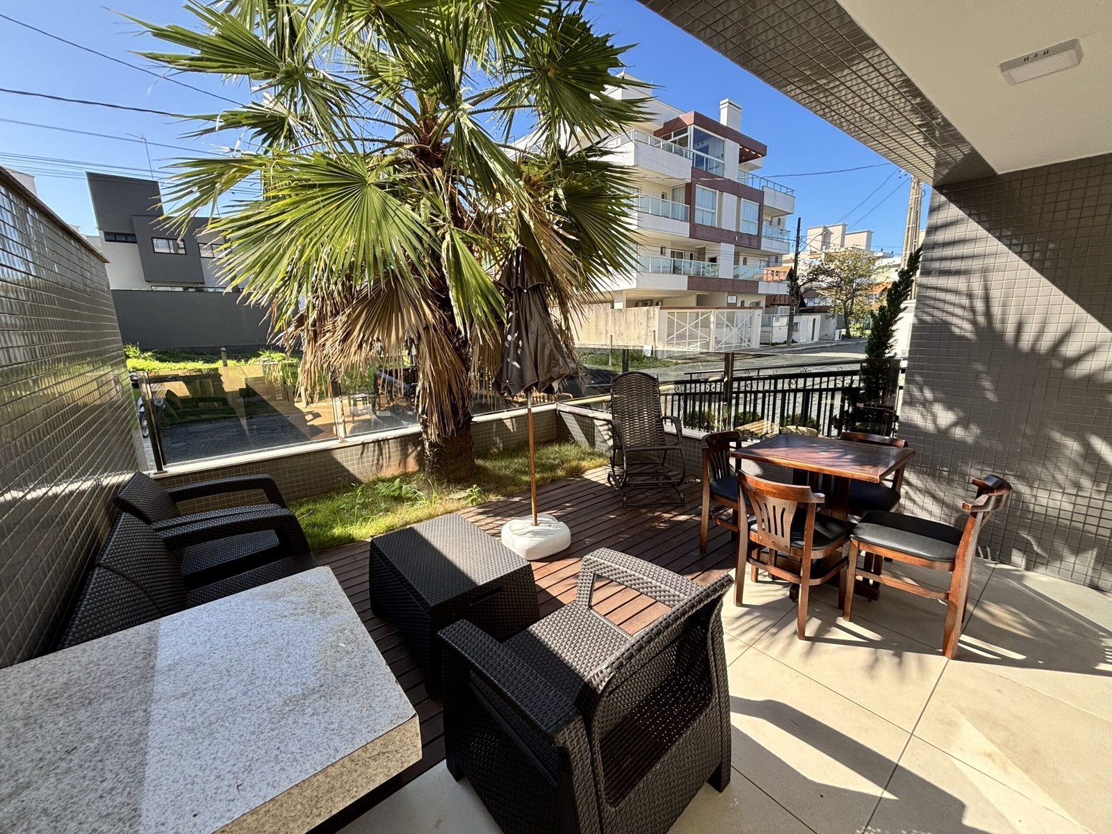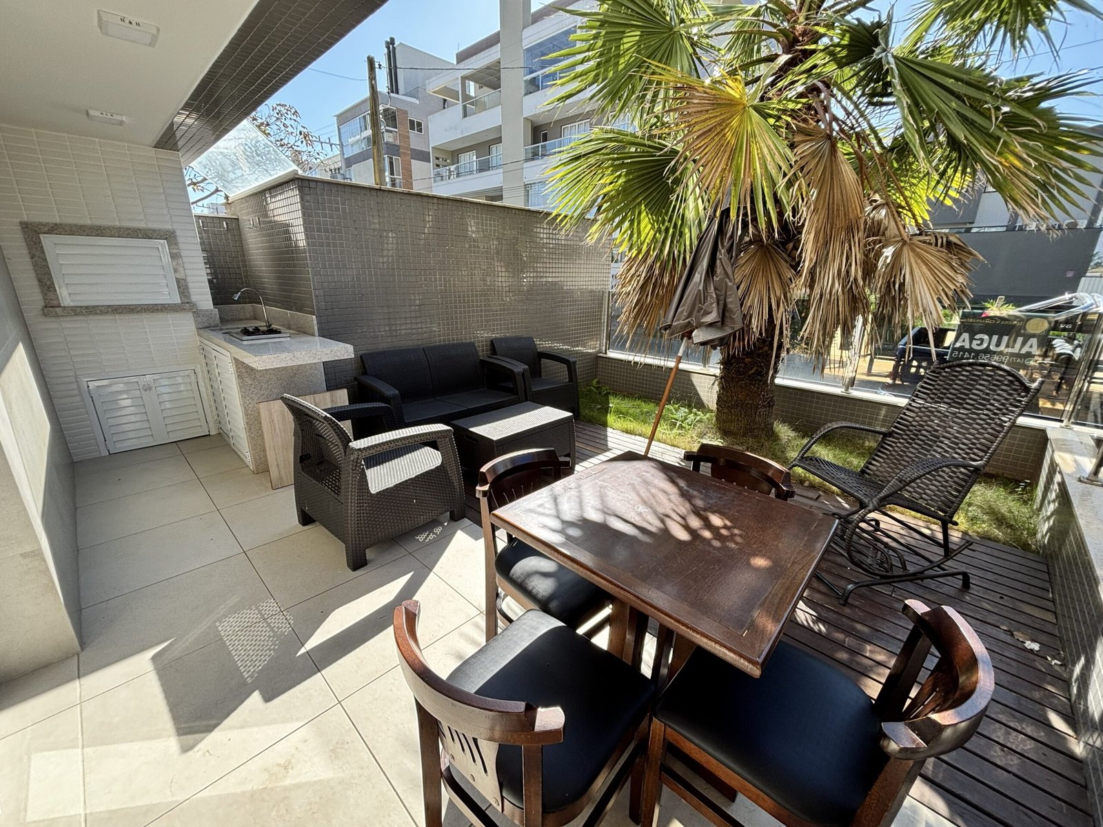 – Patio privado con asador, deck, sillones, mes y sillas
