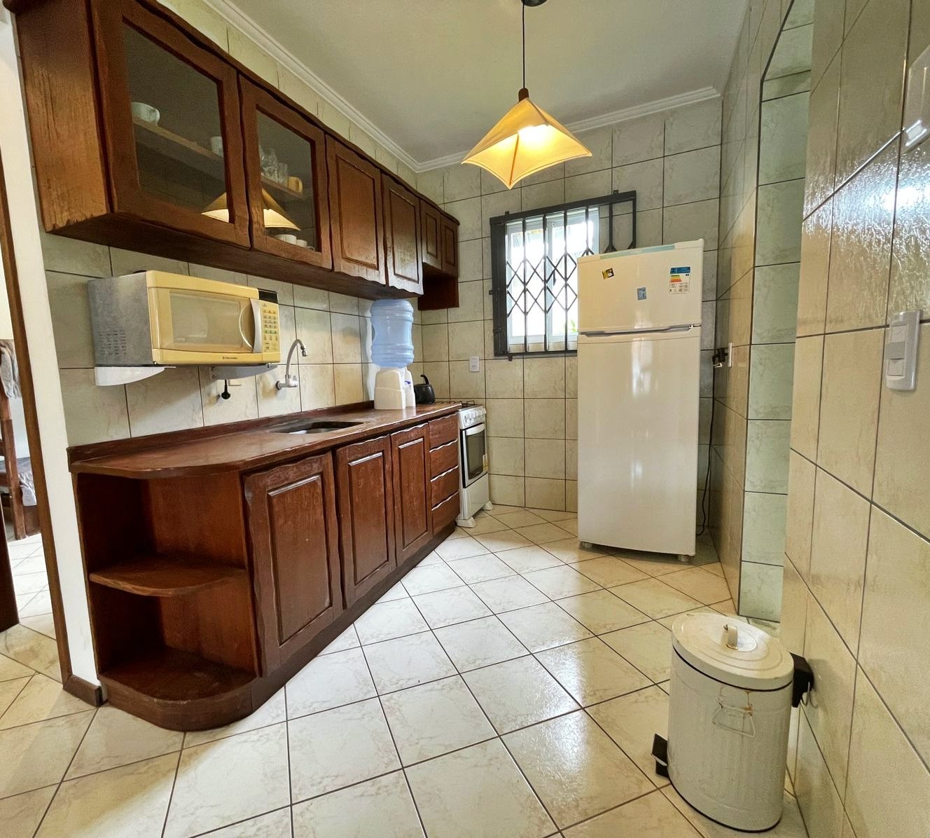 – Cocina completa con refrigerador, cocina, microondas y otros utensilios